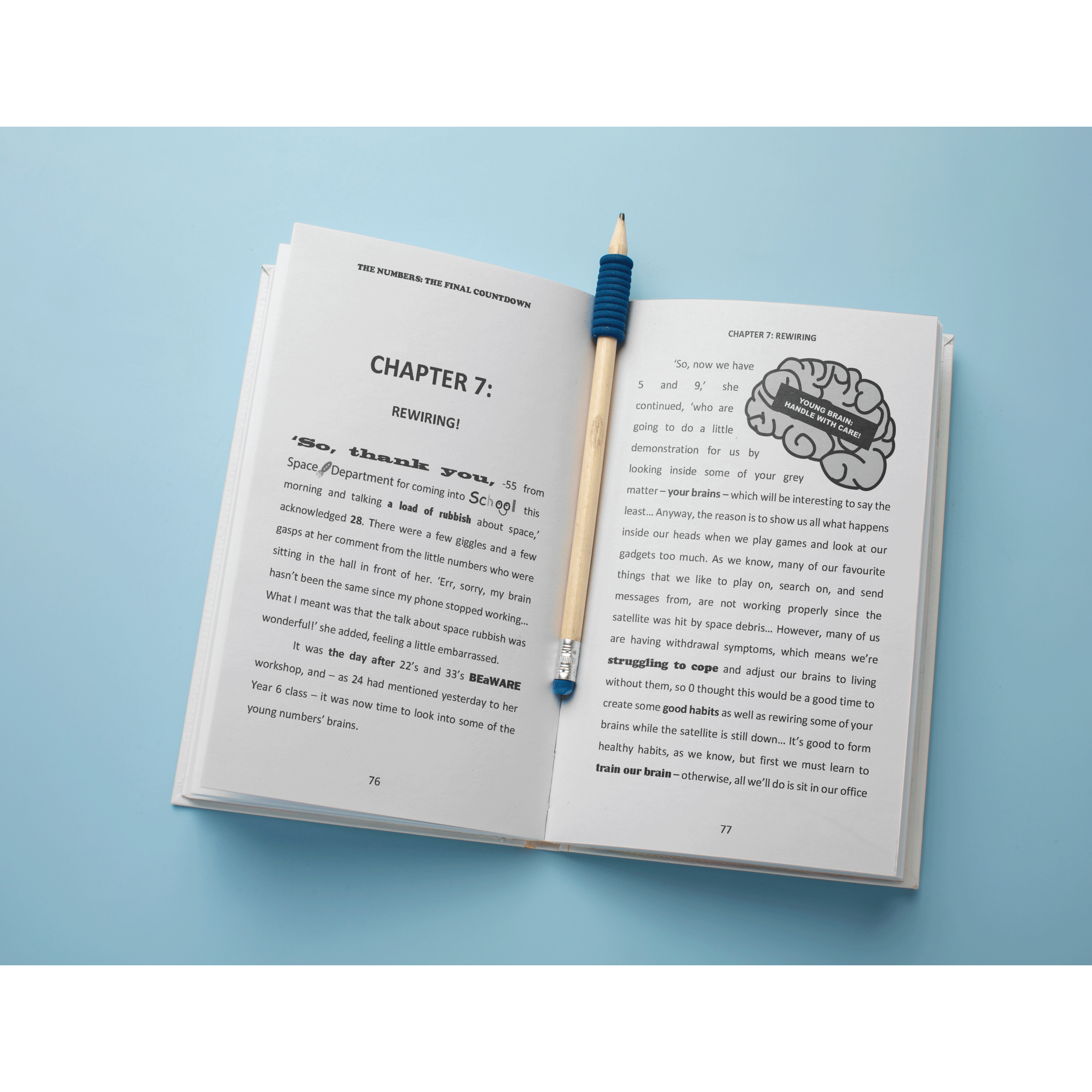 Things have been odd for a while, with bright lights still being seen ripping though the sky above. However, many numbers down below are so busy with their gadgets, in their own little worlds, that they fail to notice! It is only when the orbiting satellite is hit by a piece of this space debris – and all communication fails – that their ‘old’ world suddenly changes. After a series of mindfulness events to help rewire, reprogramme, and reconnect their brains, many start to enjoy this ‘new’ face-to-face communication.